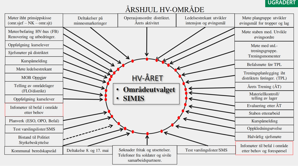 • Årshjul for Heimevernsområdet, inkludert telling av områdelager, utvikling av øvingsordre, bistand til politiet, styrkebeskyttelse, sjefsmøter, infomøter, materiellkontroll, og evaluering etter trening.
